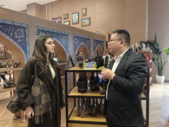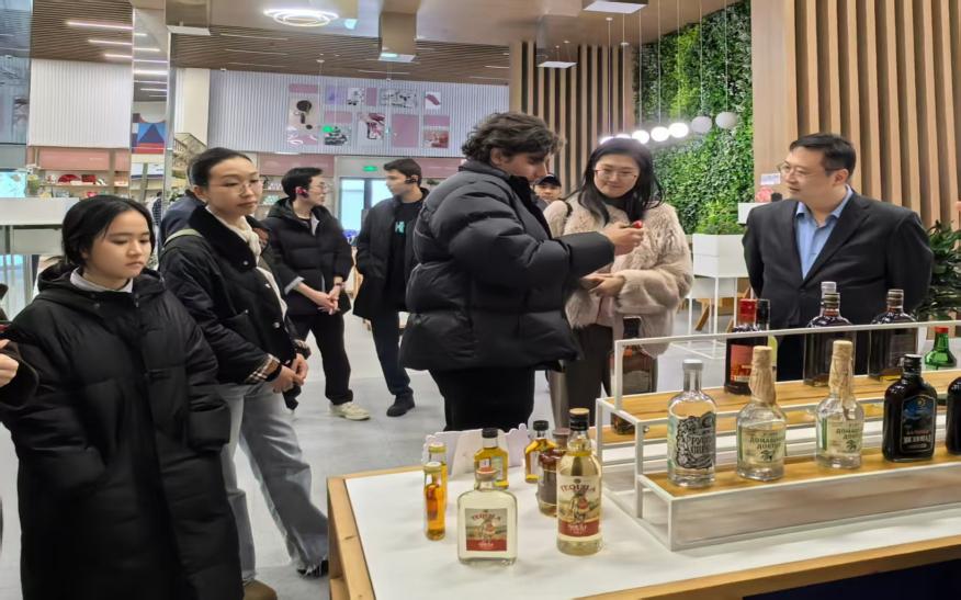活动现场,上海外高桥保税区国际人才服务有限公司工作人员详细解读了平台的运营模式与各国商品展示特色,从叙利亚的手工精油香皂、伊朗的纯手工羊毛地毯,到大洋洲的红酒、奶制品等,生动体现出各国产业特色与发展差异,不少同学在各自国家的展馆前驻足,看到熟悉的特色商品与生活用品时纷纷驻足交流,深切体会到中外贸易往来带来的文化共鸣与生活联结,学生们不仅聆听讲解,也积极参与互动。在格鲁吉亚展台,学生Nina主动介绍本国特色酒类;在俄罗斯展台,ARSENII分享了俄罗斯的传统酒品与食品,现场交流气氛热烈。工作人员还系统梳理了自贸区的发展脉络——从1990年保税区设立推动外资独资落地,到2013年自贸试验区实施负面清单管理,贸易便利化改革与政策创新持续深化,让学子们直观感受到自贸区建设与社会发展的紧密联动。