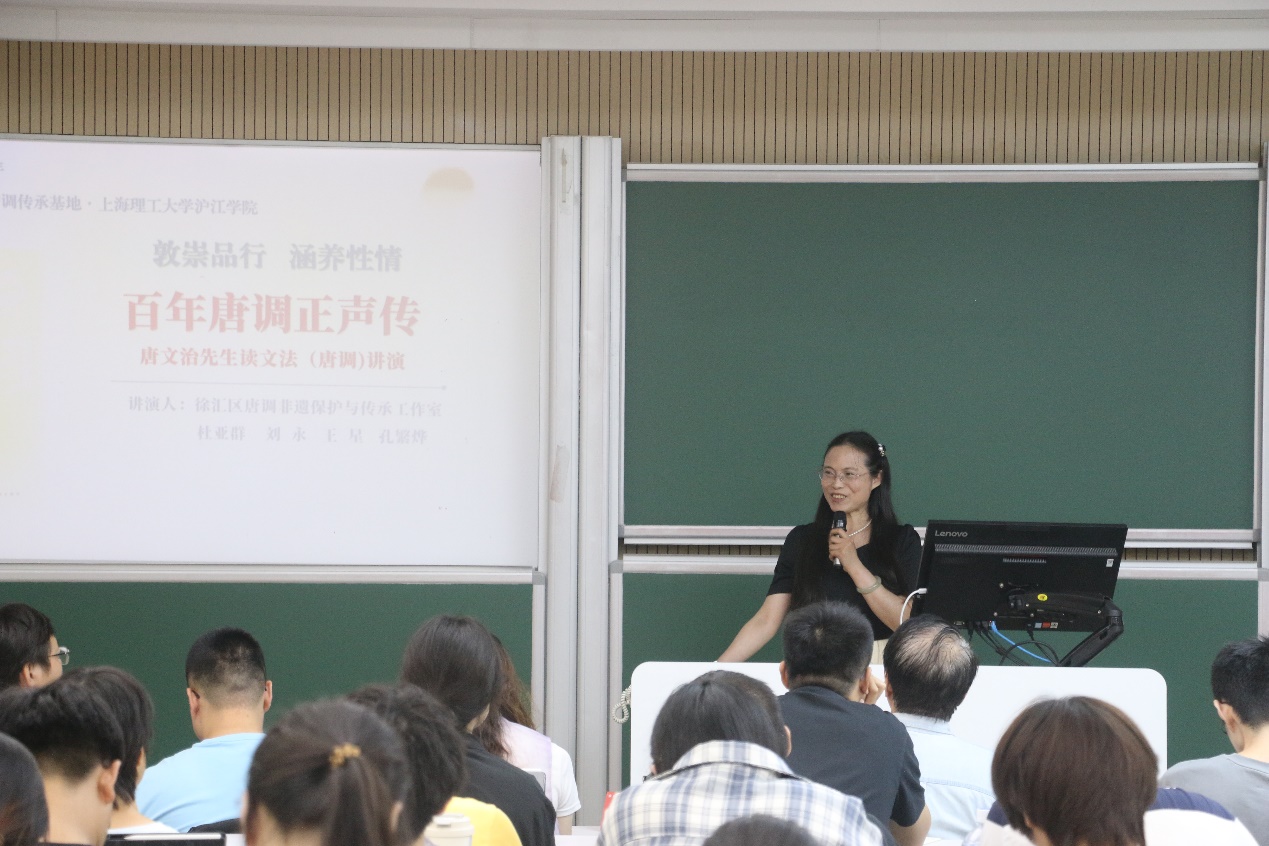 随后,徐汇区唐调非遗项目负责人、全国“十佳吟诵传习人”、上海市市北中学高级教师杜亚群老师做了题为《百年唐调正声传》的讲座。杜老师介绍了唐调的历史源流,区分了唐调读文法在《诗经》、《楚辞》、儒家经文、后世散文中的不同应用,并和徐汇区唐调非遗传承与保护工作室成员现场演绎了唐调吟诵的悠长韵味,赢得了上理学子的阵阵掌声。