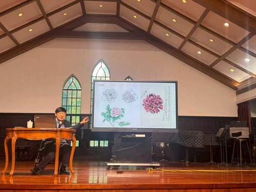讲座中,汤兆基先生深情回顾了自己的艺术师承之路。他师从白蕉、申石伽、钱君匋等海上艺术大家,深厚的学脉积淀为其艺术创作筑牢根基。求学时恩师“坚持下去,前途无量”的勉励,成为他数十载潜心钻研、坚守传承的精神动力。他以独创的“牡丹学”为核心,将牡丹之美升华为“贵气、高情、劲骨”的精神境界,结合“以形写神”“气韵生动”“知白守黑”等传统画理,细致解读笔墨章法、构图布局与意境营造,让师生深刻领会东方美学的哲思与韵味。他还分享了荣获“天马金奖”、世界手工艺竞赛夺冠等重要成果,以及《铁笔左篆》《瓷器上的国色天香》等著作的创作心得,提出高品质国潮与艺术衍生品是美育走进生活、连接大众的有效路径。