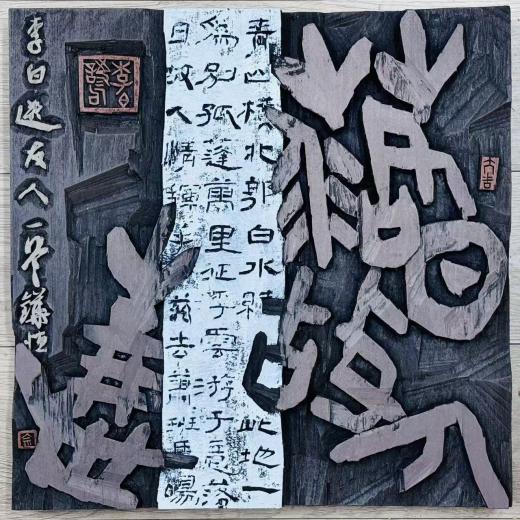 该作品由我校书法刻字培训班负责人董剑戟老师选送,创作者是我校本科大二学生佘铧恒。董老师谈到,此次选送的作品《落日故人情》,内容取材于唐代诗人李白代表作《送友人》,诗作虽为送别题材,却无半分低落愁绪,通篇尽显旷达乐观的气度。作品构思精巧、意蕴深远:中间色块舒展凝练,宛如一条清亮通畅的康庄大道,寄托着对两岸未来发展的美好冀望;主题书体选用两千年前的大篆,笔韵古朴厚重,生动彰显中华文脉的源远流长与古雅隽永;创作中特意将刻眼落在左下角的“情”字上,以细腻的肌理,淋漓尽致地传递出两岸同胞间的骨肉之情。