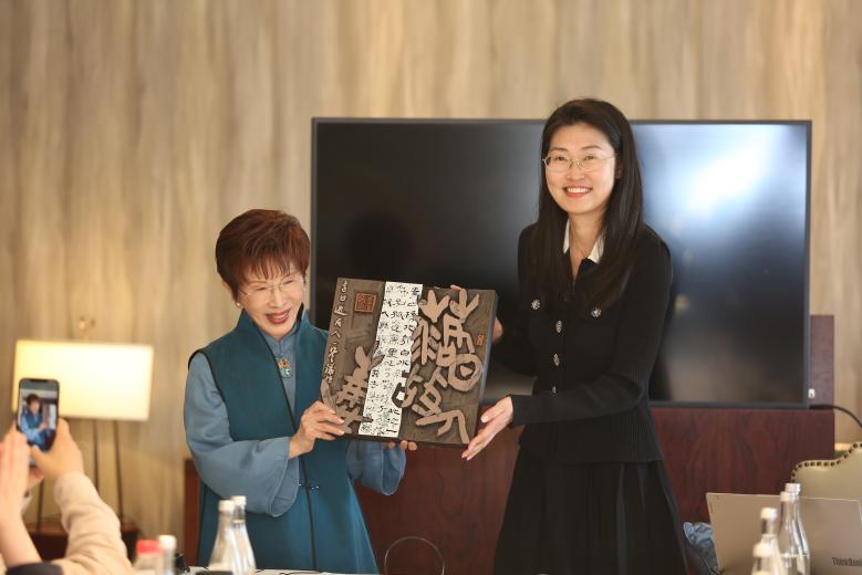近日,“同契之光”两岸青年学人研习营活动在上海举行。研习营学员、艺启视觉美育工作室主持人李娇老师代表沪江学院向中国国民党前主席洪秀柱女士赠送了我校大学生创作的书刻作品《落日故人情》。